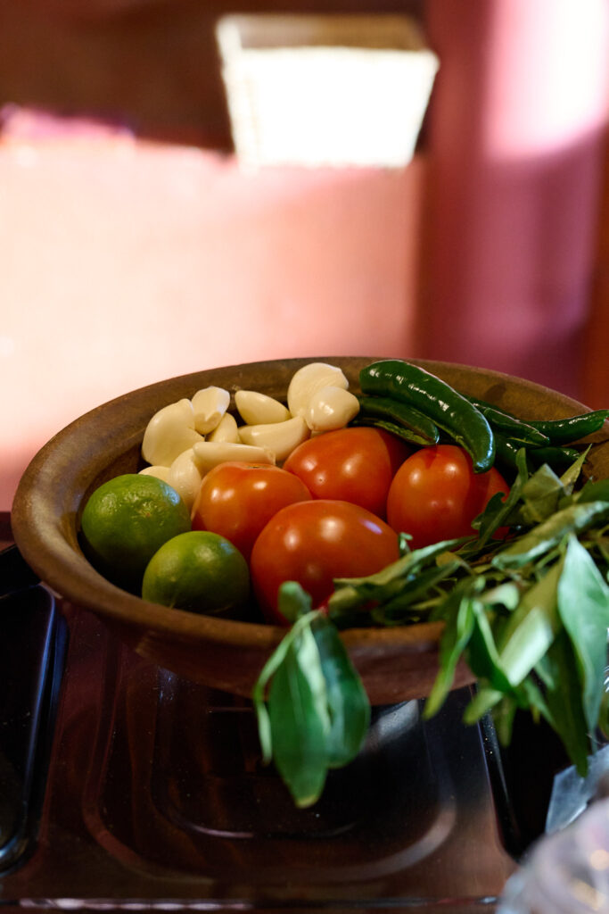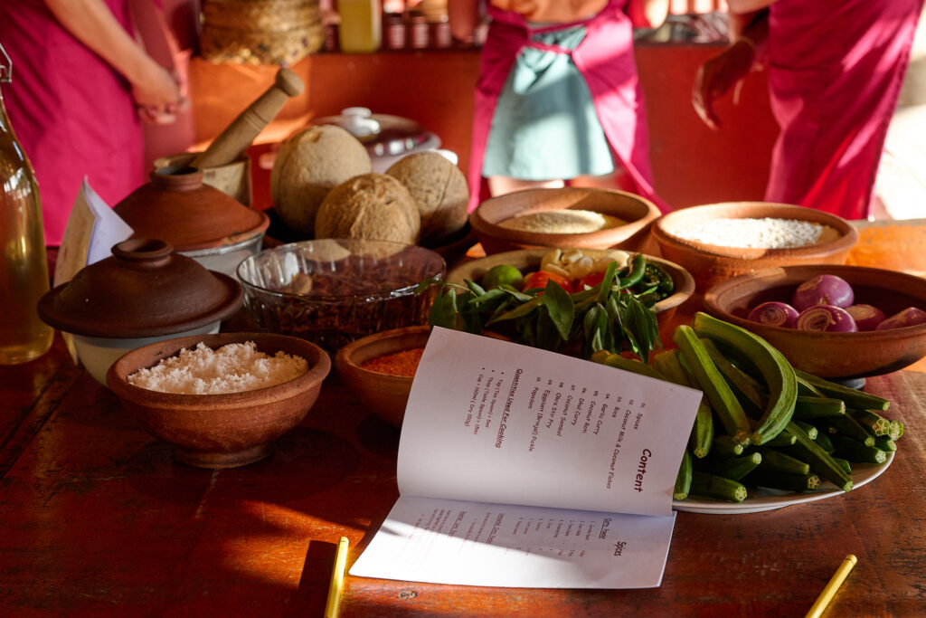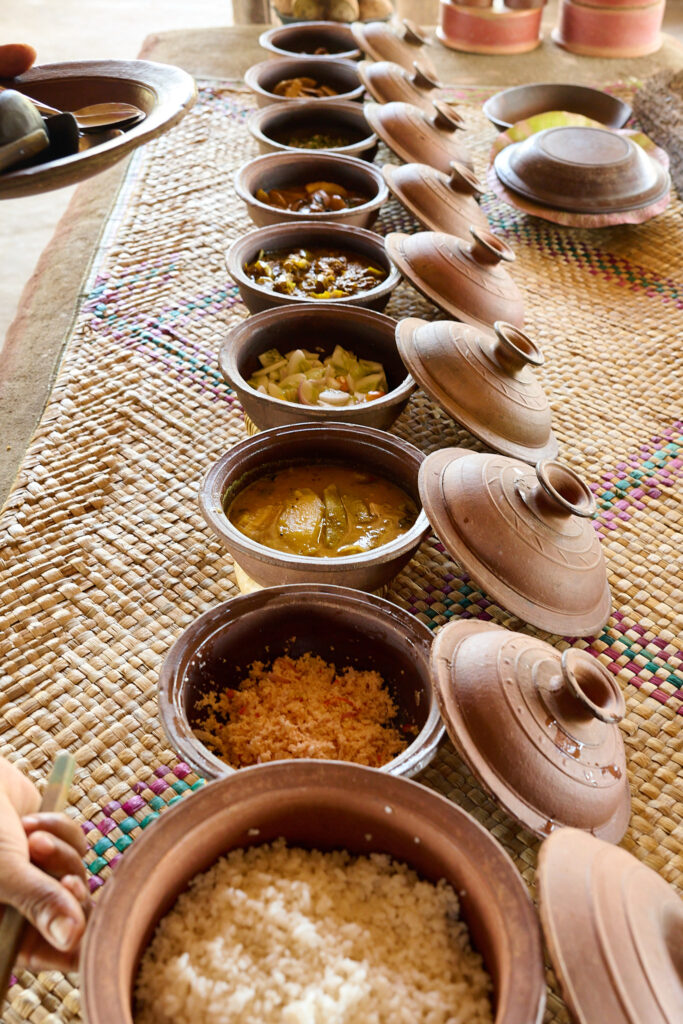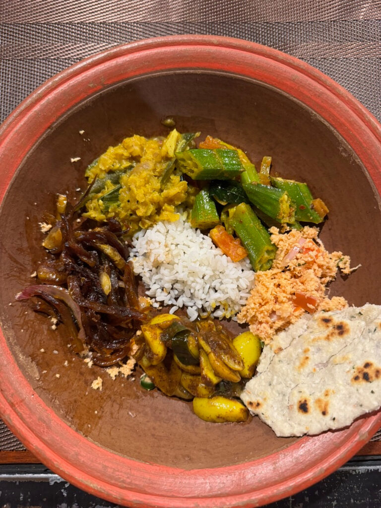 Lunch was a feast of nine dishes, each one showcasing fresh ingredients and bold spices. The unique mango curry, gourd and pumpkin curries, cucumber salad, a mix of sambols, and fried local fish made for an excellent lunch.