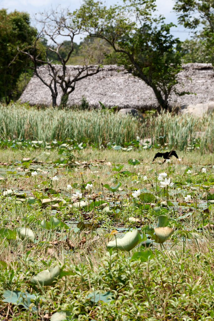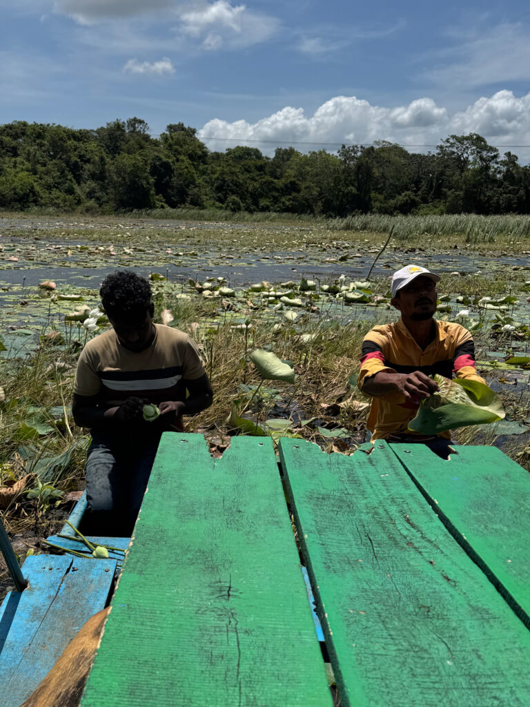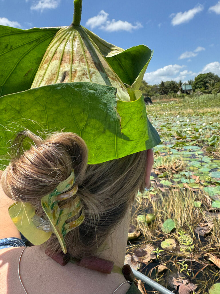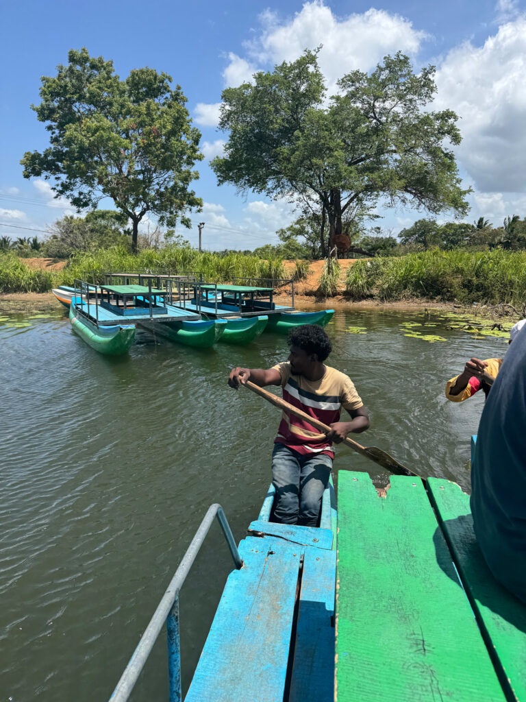Our other cooking demonstration on this trip was a little different. In Sigiriya, my overwhelm and inability to say no steered us toward a different experience than one I would have chosen myself. The journey getting there was apparently a must do in Sigiriya and clearly a solid part of the tourist itinerary. After a short, bumpy trip in a traditional bullock cart, we crossed a small dam in a Sri Lankan fishing boat (oruwa) where the boatmen showed us how to fashion hats from lily pad leaves and then promptly decorated my daughter with bits of lily flower jewellery, a skill so inventive that I suspect we may never have occasion to use it again.