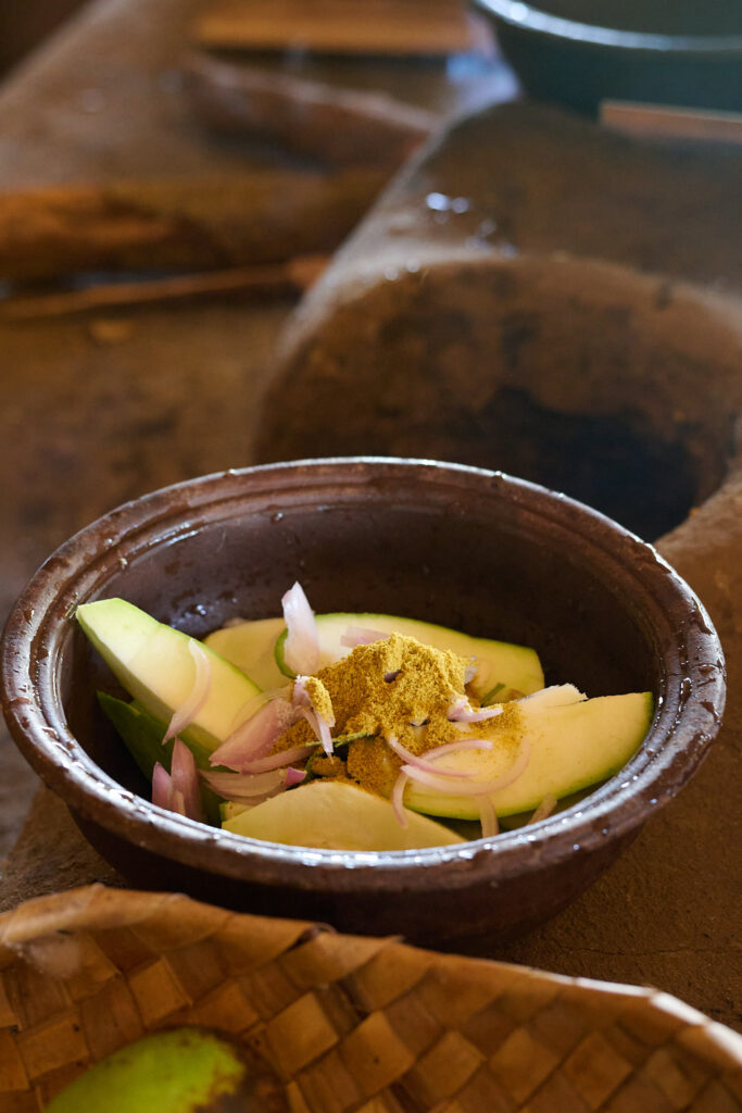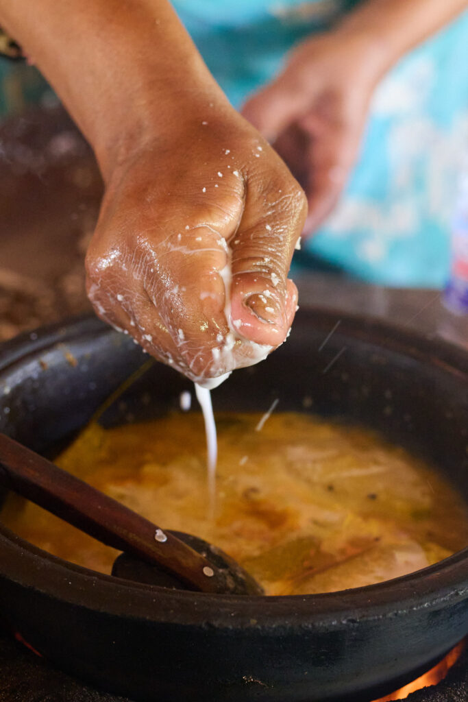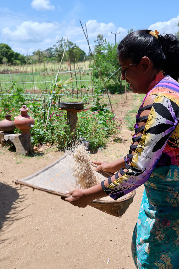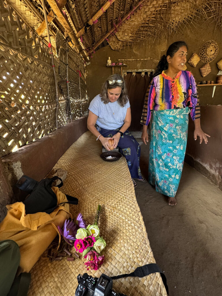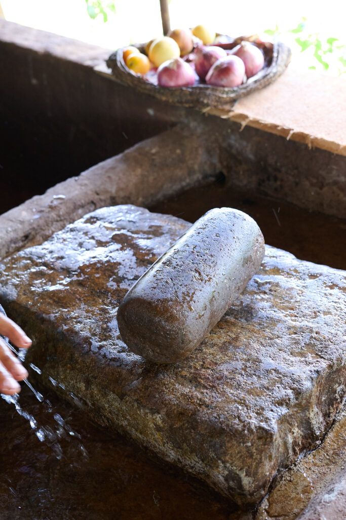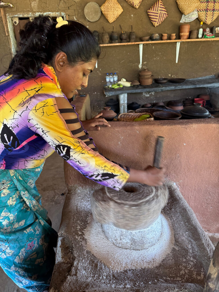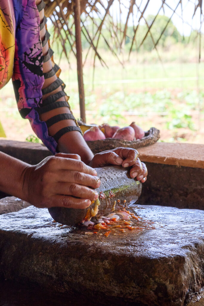 On our arrival, the preparations for lunch were already underway. I think the term “farm to table” aptly applies here. The vegetables were grown on site, right down to the rice, which was shucked in front of us. We prepared the coconut milk from scratch and then strong armed our way through rolling the sambol on a traditional miris gala, a flat stone slab with a pestle. Cooking was done over outdoor kitchen fires, with clay pots as the vessels, giving everything a smoky, earthy aroma.